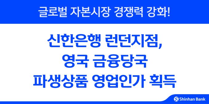 [서울=뉴스핌] 채송무 기자 = 신한은행 런던지점이 13일 영국 금융당국(FCA, PRA)으로부터 고객 대상 파생상품 영업 인가를 획득했다. [사진=신한은행]2025.08.18 dedanhi@newspim.com |