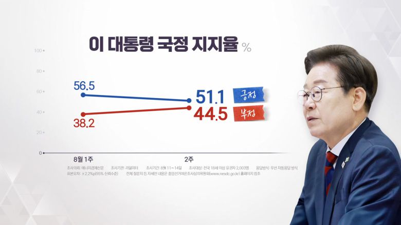 이렇게 향후 행보에 관심이 주목되고 있는 조국 전 대표의 이야기하고 있었는데요. 광복절 특별사면 등이 대통령 지지율엔어떤 영향을 미쳤을까요. 오늘 나온 리얼미터 여론조사로확인해 보겠습니다. 대통령의 국정수행에 대한 긍정 평가51. 1%로 지난주보다 5. 4%포인트 하락했습니다. 2주 만에 12. 2% 포인트 떨어진 것으로대통령 취임 후 가장 낮은 지지율입니다. 리얼미터는"광복절 특별사면 논란에 대한 실망감, 주식 양도세 논란 등이 복합적으로 작용한 것으로 보인다"고 분석했는데요. 연령대별로 보면20대에서 9. 1%포인트 떨어져 낙폭이 가장 컸습니다. 정당 지지율로 보겠습니다. 민주당은 8. 5%포인트 떨어지고국민의힘은 6. 4%포인트 올랐습니다. 민주당 지지율을 자세히 보면민주당의 핵심 지지층으로 분석되어 온40대와 광주 전라 지역 낙폭이 큰 것이 눈에 띕니다. 사면이 대통령 지지율에 영향을 줄 것이다, 어느 정도 대통령실에서도 예견했을 것 같아요. 그런데 이렇게 수치로 나왔을 때 또 느끼는 바가 다를 수 있다는 생각도 듭니다.