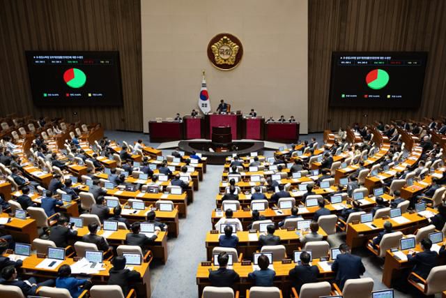 초·중등교육법 일부개정법률안(대안)에 대한 수정안이 지난 4일 서울 여의도 국회에서 열린 제427회 국회(임시회) 3차 본회의에서 재석 250인 중 찬성 162인, 반대 87인, 기권 1인으로 가결되고 있다. 뉴스1 |