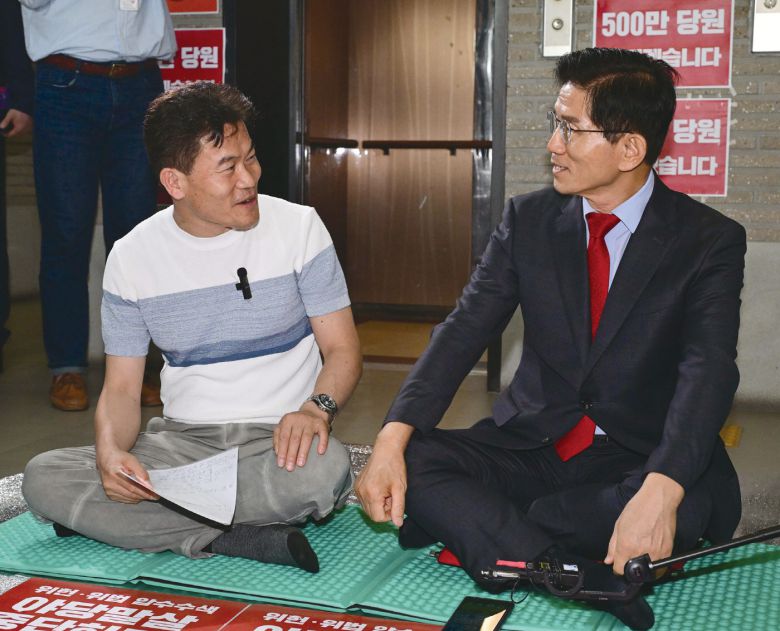 한국사 강사 전한길씨(왼쪽)가 18일 서울 여의도 국민의힘 중앙당사를 찾아 농성 중인 김문수 당 대표 후보와 대화를 나누고 있다. /이병화 기자