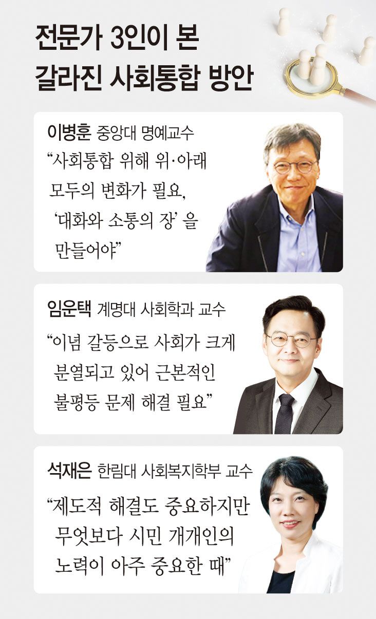 전문가들은 갈라진 사회를 통합하기 위해선 시민 모두가 소통과 대화, 타협과 협력의 노력을 보여줘야 한다고 입을 모았다. 특히 사회통합을 가로막는 정치 양극화와 사회적 불평등이 결국 공동체의 삶을 해친다는 점을 깨달아야 한다고 했다.