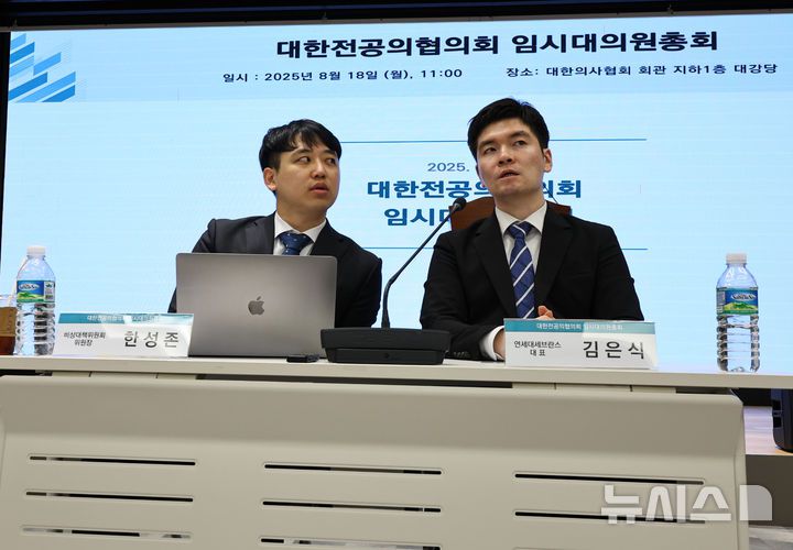 [서울=뉴시스] 최진석 기자 = 한성존 대한전공의협의회 비상대책위원장이 18일 서울 용산구 대한의사협회 회관에서 열린 임시대의원총회에 앞서 김은식 연세대세브란스 전공의 대표와 대화를 나누고 있다. 2025.08.18. myjs@newsis.com