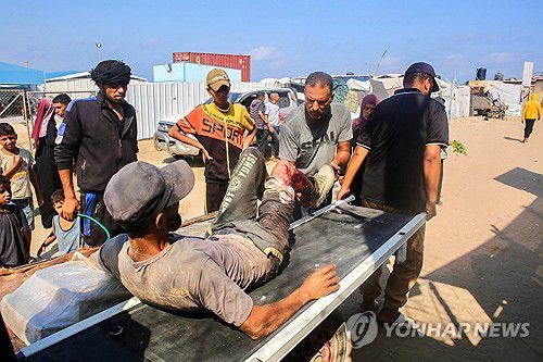 (라파 AFP=연합뉴스) 지난 7월 28일(현지시간) 가자지구 남부 라파의 알마와시 지역에 있는 국제적십자사 야전병원으로 부상자가 실려온 모습. 2025.8.18 photo@yna.co.kr |
