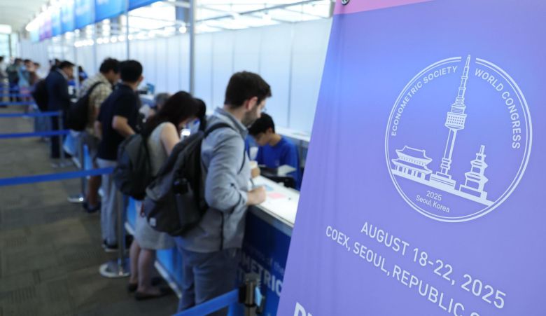 18일 서울 강남구 코엑스에서 열린 2025년 세계경제학자대회에서 참석자들이 참가자 등록을 하고 있다. 세계경제학자대회는 ‘계량경제학회’가 주최하는 행사로, 1965년 이탈리아 로마를 시작으로 5년에 한 번씩 세계 주요국에서 열린다. 한국에서 열리는 건 이번이 처음이다. 2025.08.18. 뉴시스 |