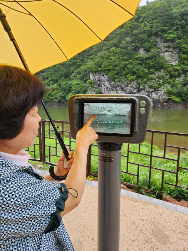 지난 12일 울산 울주군 언양읍 대곡리 반구대 전망대에서 정윤점 문화관광해설사가 디지털 망원경으로 암각화 중 침수되지 않은 부분을 찾고 있다. 울산=박은경 기자