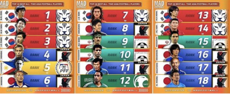 중국 최대 포털 사이트 ‘시나스포츠’는 19일(한국시간) “아시아 역대 최고의 선수 18인에 우레이도 없고, 순지하이도 없다. 한 유명 매체가 선정한 18인에 한국 선수 6명, 일본 선수 7명, 이란 선수 3명, 그리고 사우디아라비아와 필리핀 선수가 각각 1명씩 포함됐다”라고 알렸다.