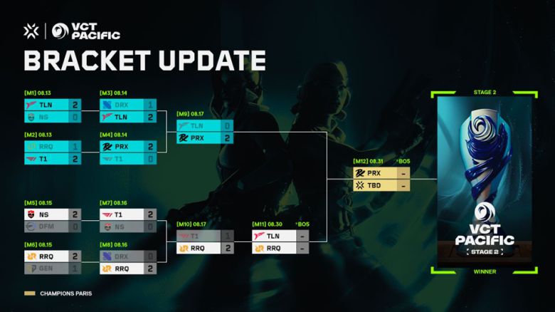 라이엇 게임즈는 지난 13일부터 17일까지 서울 마포구 상암동 SOOP 콜로세움에서 열린 VCT 퍼시픽 스테이지 2 플레이오프 결과를 18일 밝혔다. 이에 따르면 페이퍼 렉스가 가장 먼저 결승 무대에 올랐고 탈론 이스포츠와 RRQ가 오는 27일 일본 도쿄 라라 아레나에서 열리는 결승 진출전을 치른다.