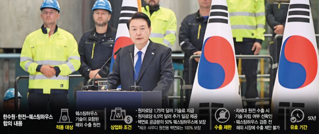 18일 서울경제신문이 확보한 ‘한국수력원자력·한국전력공사 및 WEC 간 타협 협정서’에 따르면 한수원이 한국형 원전을 수출할 때 원전 1기당 6억 5000만 달러(약 9000억 원)어치의 물품 및 용역 구매 계약을 WEC 측에 제공하고 1억 7500만 달러(약 2400억 원)의 기술 사용료도 납부해야 하는 것으로 나타났다. 한국 측이 SMR을 포함한 모든 차세대 원전을 독자 수출하려면 WEC의 기술 자립 검증도 통과해야 한다. WEC 측 판단에 따라 원전 수출에 제동이 걸릴 수도 있다는 의미다.