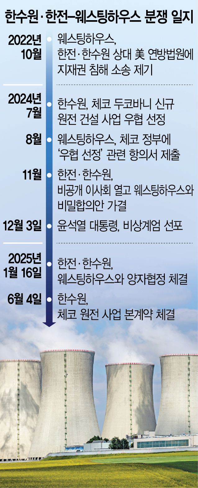 한국이 WEC와 굴욕적 계약을 맺은 이면에는 체코 원전 사업이 있다. 한수원은 지난해 7월 WEC와 프랑스전력공사(EDF)를 제치고 체코 원전 사업 우선협상 대상자로 선정됐는데 이후 WEC 측이 ‘한수원이 수출하려는 원자로(APR1000)에는 자사 기술이 포함돼 있어 수출을 할 수 없다’고 주장했다. 한수원과 정부는 당초 계약에 문제가 없다는 입장이었지만 이후 돌연 입장을 바꿔 6개월 만인 올 1월 WEC와 지식재산권 분쟁을 종결하는 합의를 타결했다고 발표했다.
