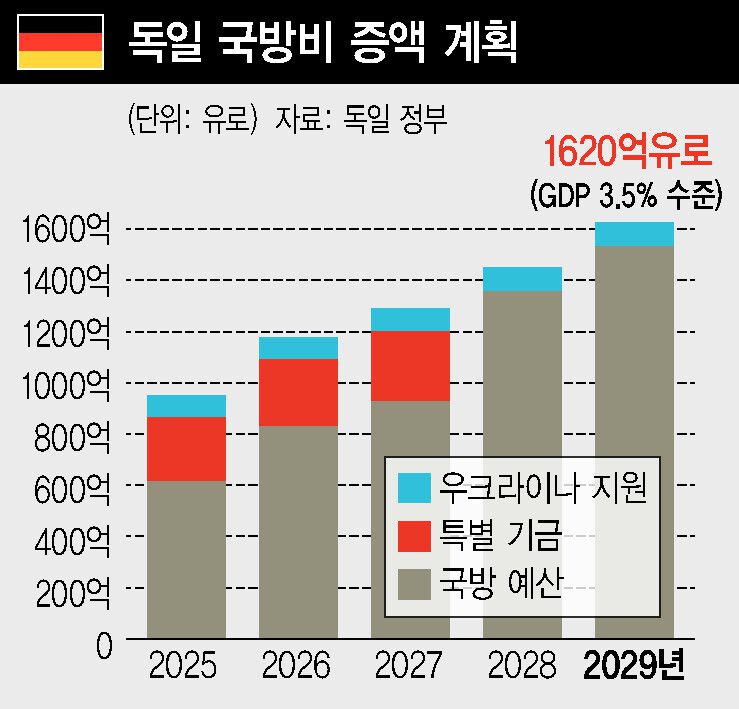독일은 전임 올라프 숄츠 총리가 러시아의 침공 직후 1000억유로(약 140조원) 규모의 특별방위기금을 설치한 이래 적극적으로 국방비 증액에 나서고 있다. 당시 국방비를 방위비 지출 목표치인 국내총생산(GDP) 대비 2%로 올리겠다고 발표했고, 2년 뒤인 2024년 목표를 달성했다. 영국 싱크탱크 국제전략문제연구소(IISS) 조사 결과, 지난해 독일의 국방예산은 그 전해보다 23.2% 늘어나 미국과 중국, 러시아 다음 세계 4위로 껑충 뛰었다. 2021∼2023년 독일의 순위는 7∼8위에 머물렀다.