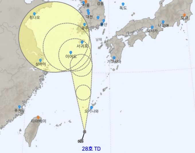 19일 오전 4시30분 기준 제28호 열대저압부 예상 경로./사진=기상청 |