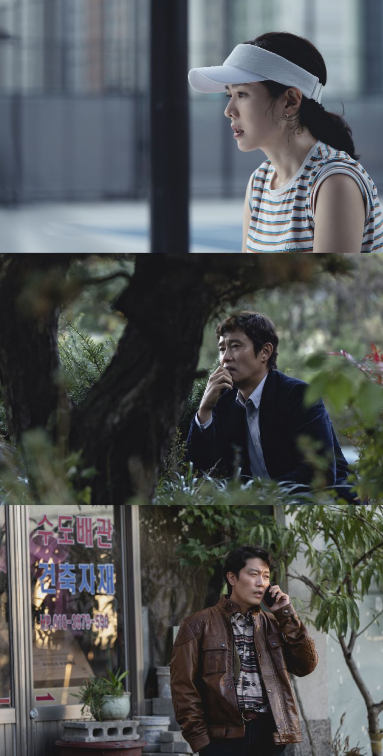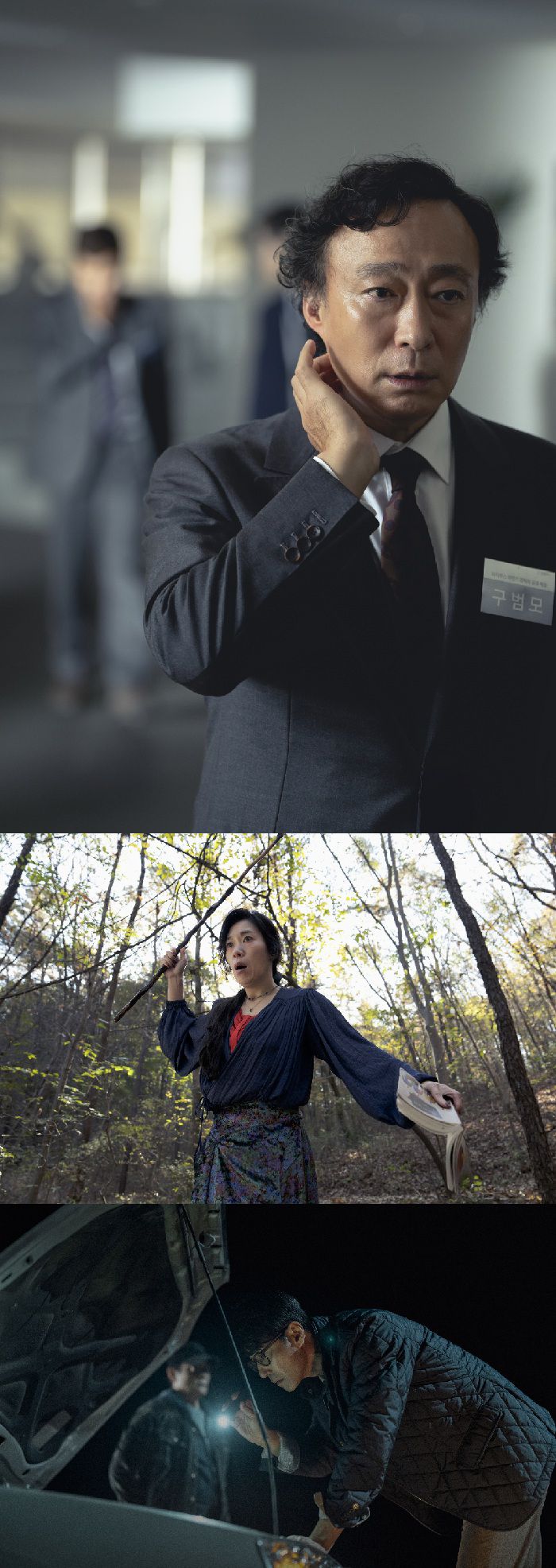 카리스마 넘치는 모습으로 통화 중인 선출(박희순)은 호쾌함과 섬세함을 오가는 입체적인 인물로, 박희순의 활약을 기대케 한다. 여기에 정장을 차려입은 범모(이성민)의 스틸은 면접을 앞둔 긴장감을 고스란히 담아내고, 양손에 책과 지팡이를 든 채 놀란 표정의 아라(염혜란)는 그녀가 마주한 예측 불가한 상황에 대한 궁금증을 불러일으킨다. 마지막으로 어두운 밤, 자동차를 살피는 시조(차승원)의 스틸은 뒤편 인물의 실루엣이 더해져 묘한 긴장감을 자아낸다.