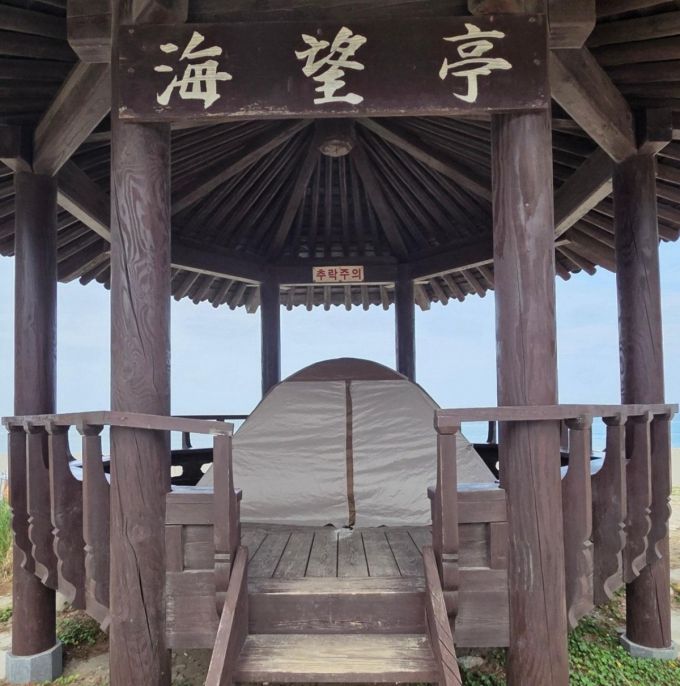 지난 18일 온라인 커뮤니티 보배드림에는 강원 삼척 하맹방 해수욕장 인근 정자를 촬영한 사진이 올라왔다. 사진을 보면 정자 한 가운데에 텐트가 쳐져 있다. 공용 공간을 독차지한 텐트 주인은 정자 바닥에 나사못까지 박아둔 상태였다.