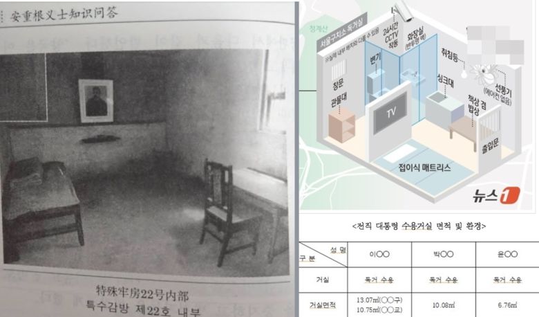안중근 의사가 죽음을 맞이할 때까지 옥살이를 했던 중국 랴오닝성 다롄시 뤼순 감옥 특수감방 제22호 모습과 서울구치소 윤석열 전 대통령 독거실 예상도. (흑룡강조선민족출판사의 '안중근 의사 110쪽 갈무리) ⓒ News1 김초희 디자이너 |