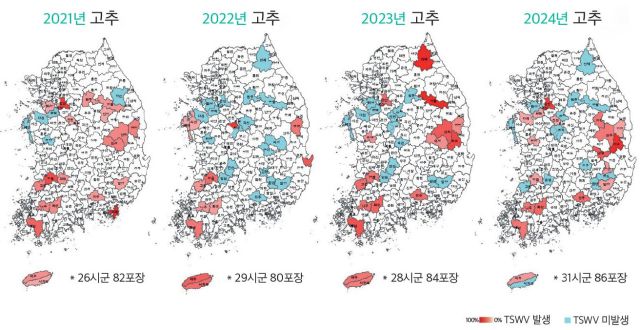 전국 분포 지도를 보면 '고추의 칼라병'으로 알려진 토마토 반점 위조바이러스(TSWV)가 최근 전국 고추밭으로 확산해 문제가 되는 것을 알 수 있다.