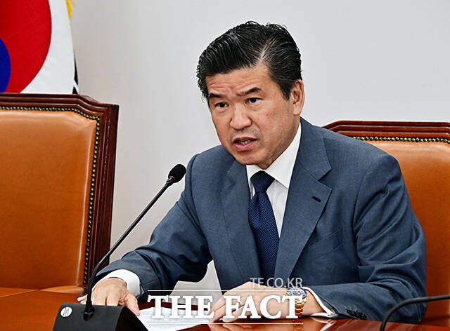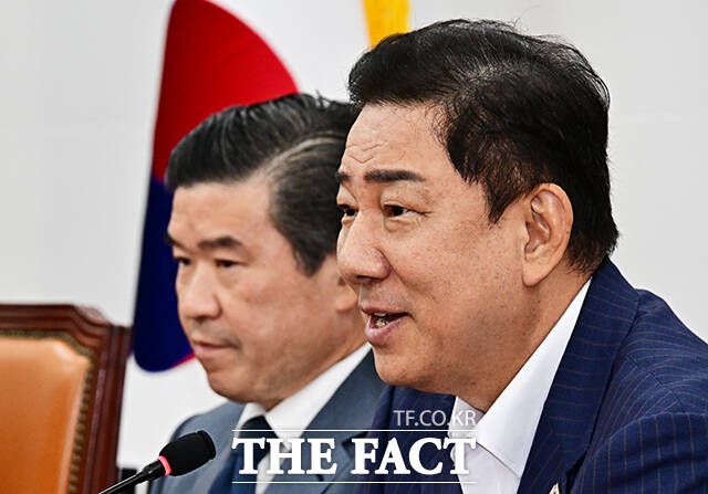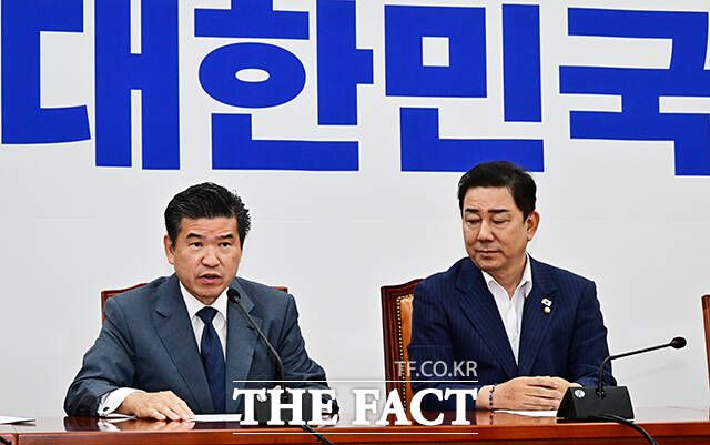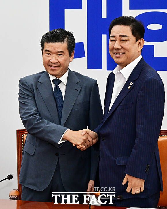 [더팩트ㅣ국회=배정한 기자] 김병기 더불어민주당 원내대표(오른쪽)가 19일 오전 서울 여의도 국회에서 제임스 김 주한미국상공회의소(암참) 회장을 접견하며 기념사진 촬영을 하고 있다.