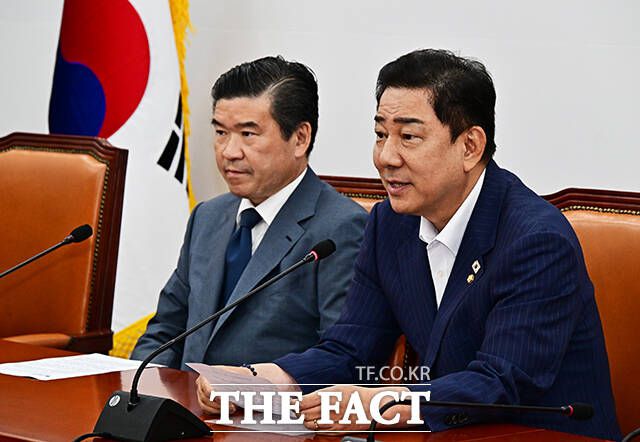 김병기 더불어민주당 원내대표(오른쪽)가 19일 오전 서울 여의도 국회에서 제임스 김 주한미국상공회의소(암참) 회장을 접견하며 기념사진 촬영을 하고 있다. /국회=배정한 기자 |