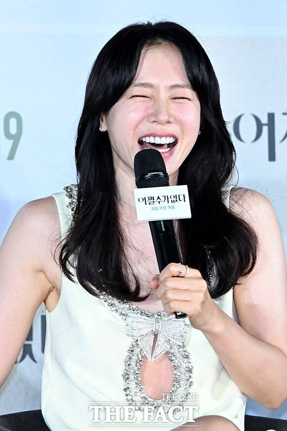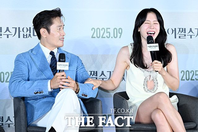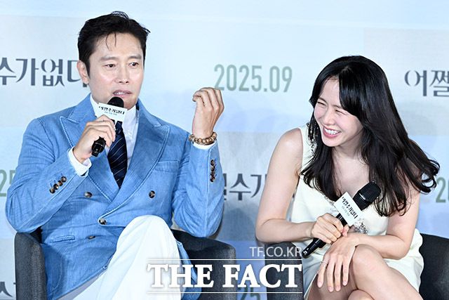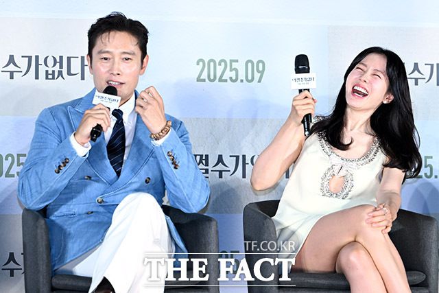[더팩트ㅣ남용희 기자] 배우 이병헌(왼쪽)과 손예진이 19일 오전 서울 용산구 CGV 용산 아이파크몰에서 열린 영화 '어쩔수가없다' 제작보고회에 참석해 질문에 답하며 환하게 웃고 있다.