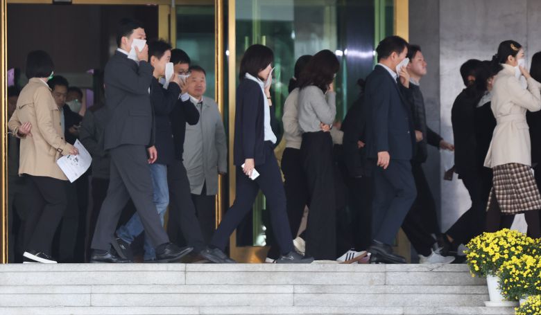 서울 종로구 정부서울청사에서 열린 화재대피 민방위 훈련에서 청사 직원들이 청사 밖으로 대피하고 있다. /뉴스1 |