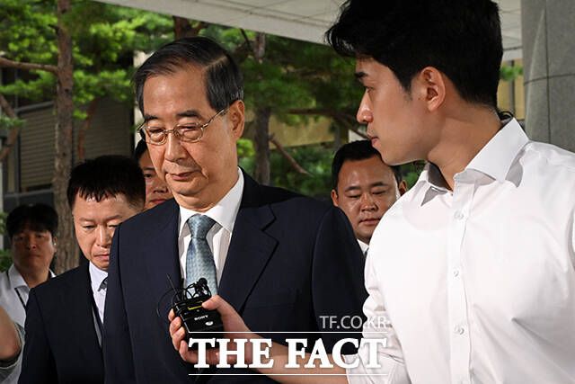 한 전 총리는 이날 오전 9시 26분께 특검팀 사무실이 있는 서울고검 청사 앞에 도착했다. 차량을 유도하는 고검 관계자가 있었음에도 취재진들을 피하는 듯한 모습을 보였으며 '여전히 내란에 가담하거나 동조하지 않았다는 입장인지', '계엄 문건을 챙기는 장면이 CCTV에 담겼다는 보도에 대한 입장이 있는지', '계엄 직후 추경호 전 원내대표와 어떤 내용의 통화를 했는지' 등을 묻자 답하지 않고 "고생하십니다"고만 말한 뒤 조사실로 곧장 들어섰다.