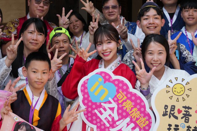 [서울=뉴스핌] 최문선 기자 = 전주한옥마을에서 이다혜 치어리더와 사진을 찍는 대만 관광객. [사진=한국관광공사] 2025.08.19 moonddo00@newspim.com |