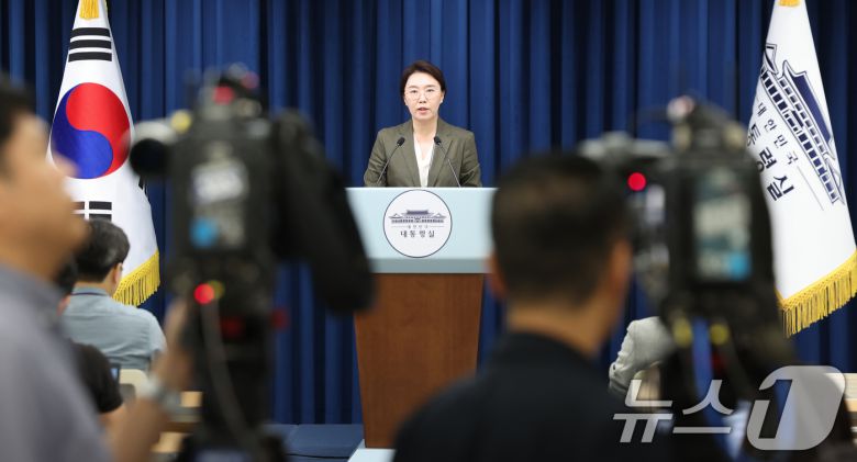 강유정 대통령실 대변인이 19일 서울 용산 대통령실 청사에서 경제단체 및 기업인 간담회 관련 브리핑을 하고 있다. 2025.8.19/뉴스1 ⓒ News1 허경 기자 |