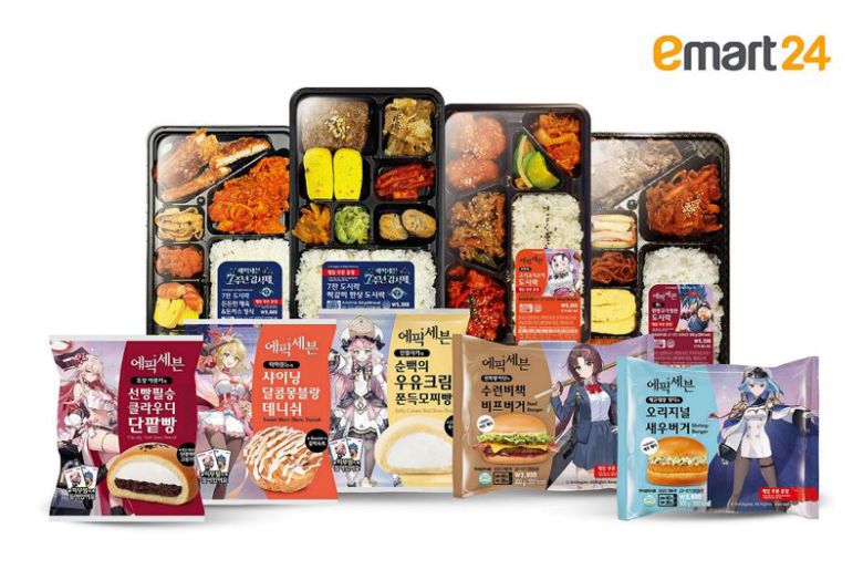 출시 상품은 '타마린느의 샤이닝 달콤몽블랑데니쉬'(2200원) '조장아룬카의 선빨필승! 클라우디단팥빵'(3000원) '안젤리카의 순백의 우유크림쫀득모찌빵'(1900원) '유피네의 고기고기고기도시락'(5300원) '켄의 반반고기정찬도시락'(5300원) '7찬도시락 떡갈비한상'(5300원) '7찬도시락 든든한제육&돈까스정식'(5600원) '전학생 아딘의 수련비책 비프버거'(3800원) '해군대령 랑디의 오리지널새우버거'(3600원) 등이다.