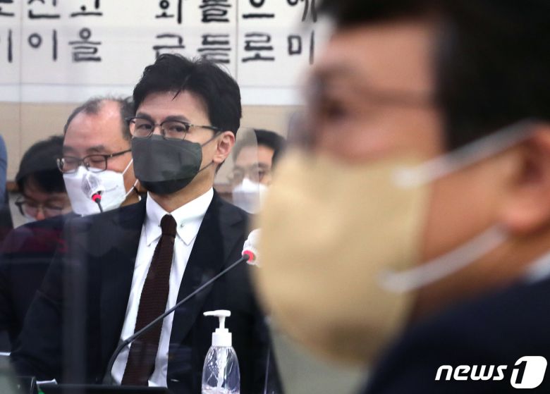 한동훈 전 국민의힘 대표(당시 법무부 장관)이 서울 여의도 국회에서 열린 법제사법위원회 전체회의에 참석해 김의겸 새만금개발청장(전 더불어민주당 의원)을 바라보고 있다. 2022.12.7/뉴스1 ⓒ News1 구윤성 기자