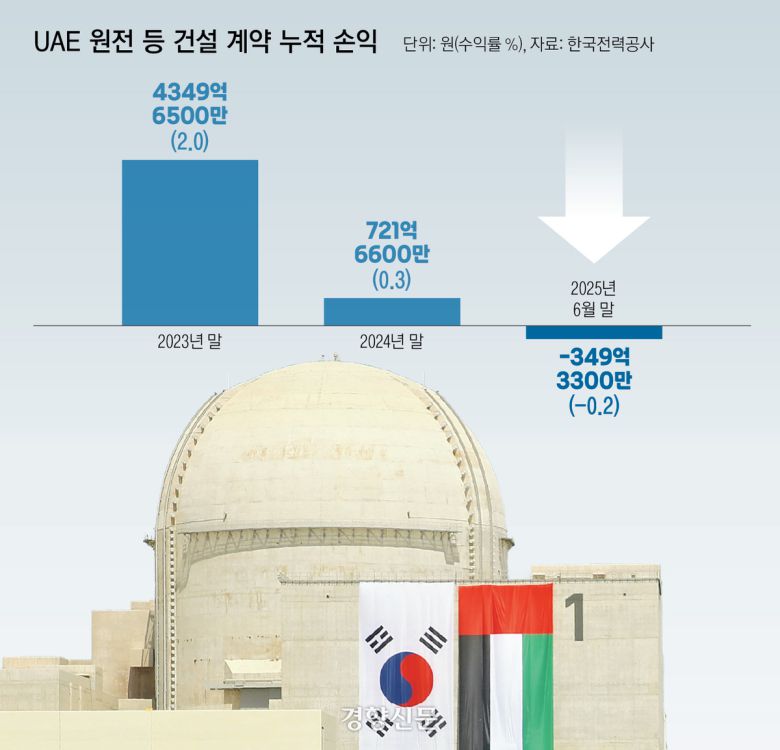 한편 한전이 담당하는 바라카 원전 사업은 누적 손익이 적자로 전환됐다. 한전의 올해 상반기 재무제표를 보면, 바라카 원전 사업이 대부분을 차지하는 ‘UAE 원전 사업 등’ 항목의 누적 손익은 지난 6월 말 기준 349억3300만원 적자를 기록했다. 이 사업의 누적 손익은 2023년 말 4349억6500만원에서 지난해 말 721억6600만원으로 급감한 바 있다. 적자를 기록한 건 이번이 처음이다. 이에 따라 누적 수익률도 지난해 말 0.3%에서 올해 6월 말 기준 마이너스 0.2%로 하락했다.