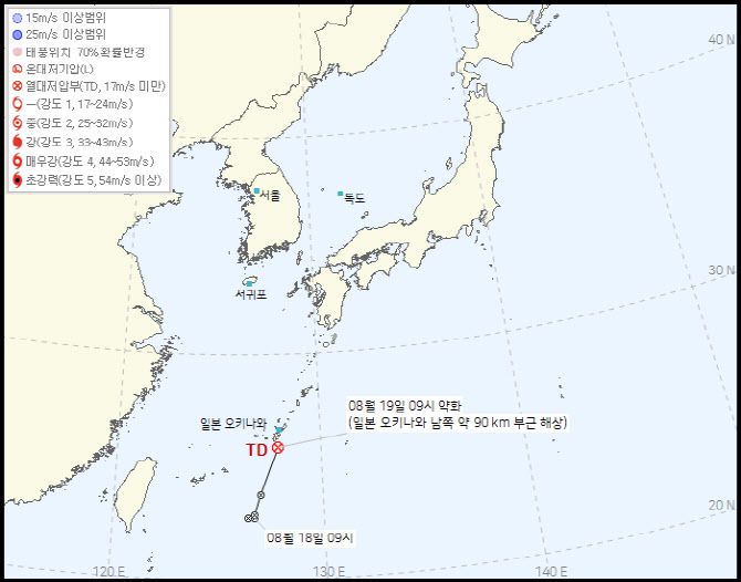 19일 기상청에 따르면 지난 18일 오전 9시 오키나와 남쪽 해상에서 발생한 제28호 열대저압부는 하루 만인 이날 오전 9시께 일본 오키나와 남쪽 약 90km 해상에서 세력이 약화했다.