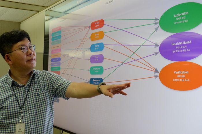 ETRI 연구진이 레드팀을 통해 AI 안전성과 신뢰성 확보를 위해 위험과 시나리오들에 대해 설명하고 있다.