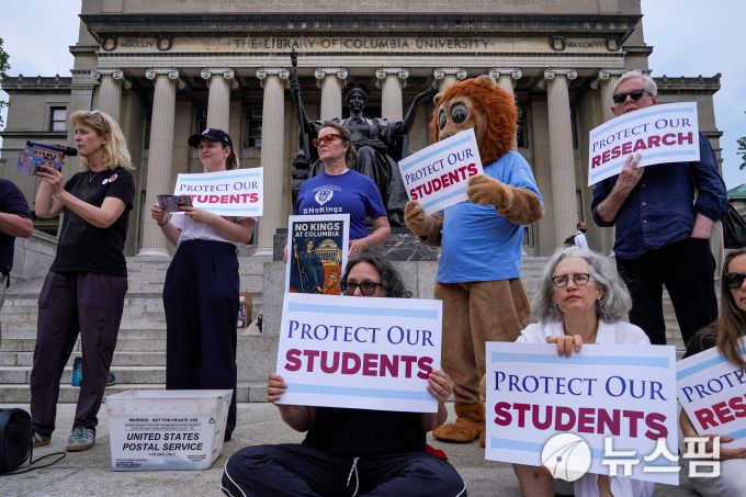 2025년 6월 6일 미국 뉴욕시 콜롬비아 대학교 캠퍼스에서 교수진과 교직원들이 교내 정책에 반대하는 시위를 하고 있다.[사진=로이터 뉴스핌] |