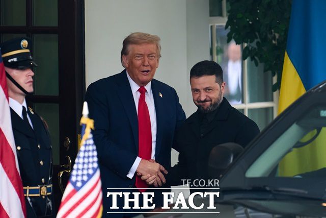 도널드 트럼프 미국 대통령(가운데)이 18일 백악관 회담에 앞서 볼로디미르 젤렌스키 우크라이나 대통령(오른쪽)을 환영하고 있다./워싱턴=신화.뉴시스 |