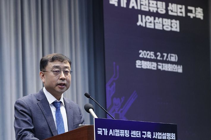 지난 2월 27일 서울 중구 은행회관에서 열린 '국가 AI컴퓨팅 센터 구축 사업설명회'에서 송상훈 과학기술정보통신부 정보통신정책실장이 인사말을 하고 있다. 연합뉴스 |