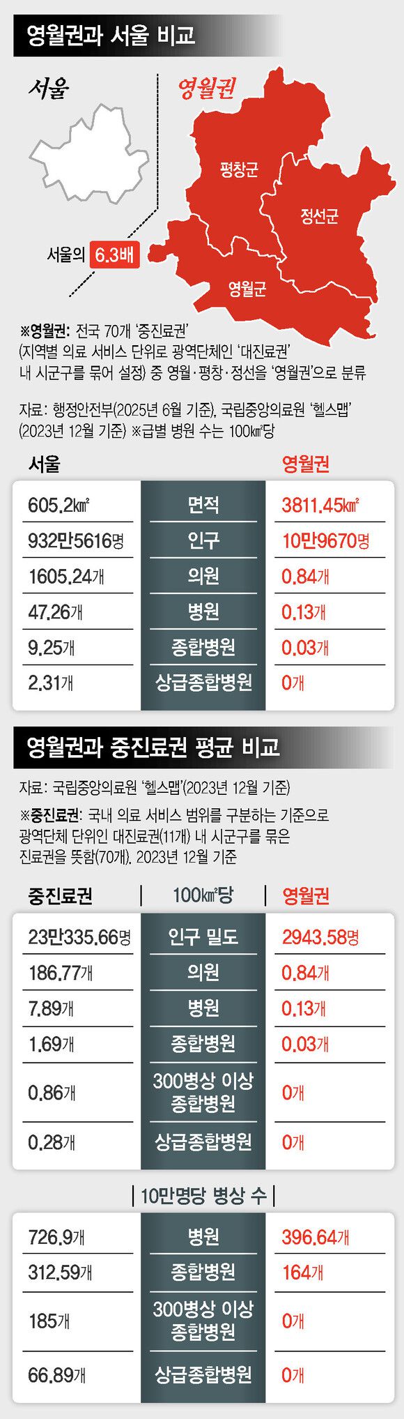 ‘어떤 대비’는 인간은 평등하다는 믿음이 처한 곤경을 드러냈다. 영월뿐 아니라 평창(1464.26㎢로 4위)과 정선(1219.78㎢ 7위)도 땅 크기에선 국내 ‘선두 그룹’이었다. 인구는 영월 등과 하위권(평창 3만9963명 189위, 정선 3만3346명 201위)을 다퉜다. 세 지역을 합한 3811.45㎢에 고작 10만9670명이 살았다. 인구(2023년 기준 11만2193명) 밀도로 따지면 100㎢당 2943.58명으로 전체 중진료권 중 최저였다. 면적은 서울(605.2㎢)의 6.3배인데 인구는 서울(932만5616명)의 85분의 1이었다.
