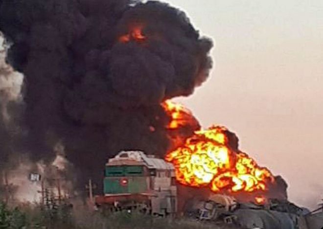 도널드 트럼프 미국 대통령과 볼로디미르 젤렌스키 우크라이나 대통령, 유럽 지도자들 간 워싱턴 회담 직후인 19일(현지시간) 러시아군이 점령 중인 우크라이나 남동부 자포리자주 몰로찬스크에서 우크라이나군 제65독립기계화여단이 자폭 드론으로 러시아군 물류 열차를 폭파했다고 우크라이나 언론이 전했다. 2025.8.19 텔레그램