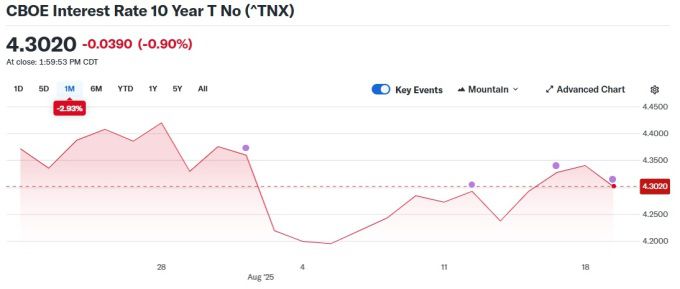 미 국채 10년물 차트, 자료=야후 파이낸스, 2025.08.20 koinwon@newspim.com |