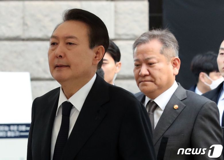 윤석열 대통령이 2022년 11월 3일 오전 이상민 행안부 장관(뒤)과 함께 서울광장에 마련된 이태원 사고 사망자 합동분향소를 찾아 조문을 마친 뒤 이동하고 있다. 2022.11.3/뉴스1 ⓒ News1 송원영 기자 |
