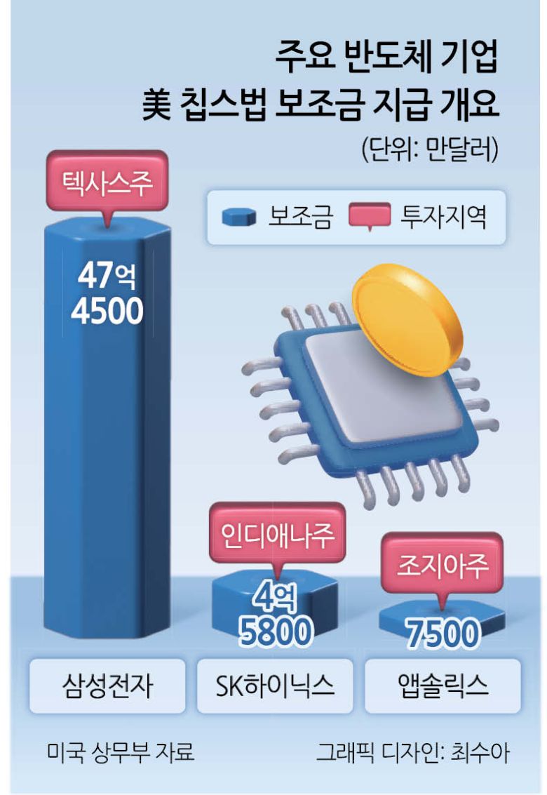 삼성전자는 텍사스주 테일러에 총 370억달러(약 51조원)를 들여 파운드리(반도체 위탁생산) 공장을 짓는 대신 보조금 47억4500만달러(약 6조5000억원)를 받기로 했다. SK하이닉스도 인디애나주에 인공지능(AI) 메모리용 패키징(조립) 생산 기지를 지을 계획으로, 최대 4억5800만달러(약 6300억원)의 보조금을 지원 받기로 돼 있다.