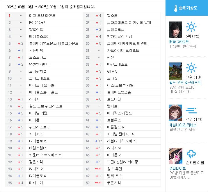 상위권에서는 배틀그라운드가 2계단 상승했다. 지난주 부가티 컬래버를 통해 스포츠카 '시론' 을 추가하고, 사용자 제작 콘텐츠 기능 UGC 알파의 확대 오픈, 레트로 감성 픽셀 아케이드 모드 ‘POBG’ 한정 복귀 등이 이루어졌다. 에스파 컬래버 이후 목말라 있던 유저들에게는 단비로 작용했다는 평가다.