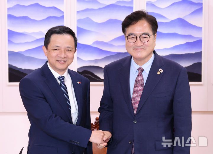[서울=뉴시스] 김금보 기자 = 우원식 국회의장이 20일 오후 서울 여의도 국회에서 다이빙 주한중국대사와 악수를 하고 있다. 2025.08.20. kgb@newsis.com