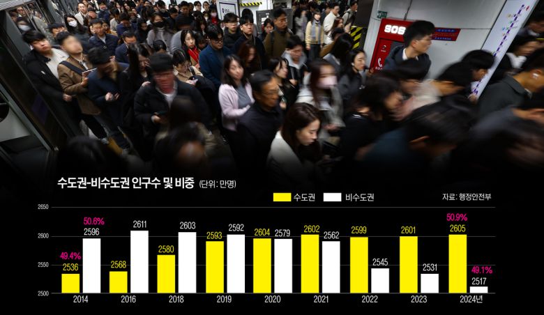 수도권과 비수도권 간의 인구 격차는 2020년 24만7591명, 2021년 40만7757명, 2022년 53만1198명, 2023년 70만3201명으로 매년 급증하다가 지난해 87만7825명으로 역대 최대치를 찍었다.