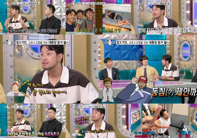 침착맨은 상극의 성향 때문에 생긴 에피소드도 공개했다. 그는 “방에 들어가면 혼자 있고 싶다는 뜻이었는데, 방에 자꾸 들어오는 거예요”라며 자신의 방에 들어온 기안84의 깨알 성대모사를 해 폭소를 유발했다. 또 그는 “기안84가 잘 때도 슬며시 이불을 갖고 와서 ‘옆에서 자면 안 되냐’고 물었다”라고 말해 놀라움을 안겼다.
