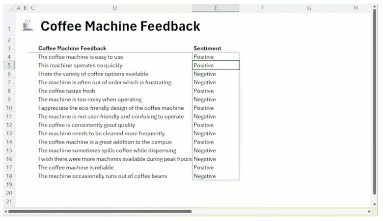 수식란에 '=COPILOT("명령문", 참조할 셀 범위)' 형태로 입력하면 된다. 예를 들어, 커피머신에 대한 고객 피드백이 여러 셀에 입력돼 있다면 '=COPILOT("Classify this feedback", D4:D18)'을 입력해 셀 내용을 AI가 해석하고 분류 결과를 출력하게 만들 수 있다.