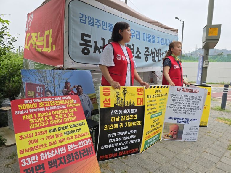 동쪽으론, 동해안 쪽 원전과 석탄화력발전소에서 생산된 전기(4GW)를 수도권의 반도체 공장, 데이터센터 등에 보내기 위한 ‘동해안-동서울 초고압직류송전망(HVDC)’ 건설 사업이 갈등을 일으키고 있습니다. 우리가 평소에 쓰는 교류 전기를 송전할 땐 직류로 바꾸어 초고압으로 보내는 것이 이 사업의 핵심인데, 한국전력공사(한전)는 이를 위해 경기 하남시 감일지구에 있는 기존 동서울변전소 안에 2026년 12월까지 ‘초고압직류송전 변환소’를 지을 계획이었어요. 그런데 이곳은 2021년부터 입주가 시작돼 현재 인구 4만명이 사는 신도시이기도 합니다. 이곳 주민들은 한전이 사업 내용을 충분히 알리지 않는 등 그간 의견수렴 과정이 충분치 않았다며 변환소 건설을 반대하고 있어요. 감일지구 주민 김은경(44) 동서울전력소증설반대 비상대책위원회 위원장은 한겨레에 “처음에 주민들은 기존 변전소 시설들을 옥내화하는 것으로만 알았을 뿐, 대규모 전력을 공급받기 위한 큰 규모의 전력시설이 들어오는 것은 뒤늦게 알았다. 주거지역에 인접한 최대 규모의 전력 시설인데, 어떻게 주민 동의 없이 건설이 가능한가” 밝혔어요. 반면 한전은 “2023년부터 주민자치회, 입주자 대표, 유관단체 등을 대상으로 총 7회에 걸쳐 옥내화와 변환소 증설 관련 사업 설명회를 시행했다”는 입장이에요.