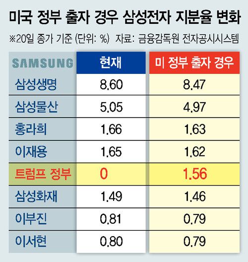 트럼프 정부 방침에 국내 기업들은 황당하다는 반응이다. 한 반도체 업계 관계자는 “기존 계약을 무시하고 지분을 받겠다는 미국 정부 얘기를 이해할 수 없다”며 “현재로선 트럼프 정부의 정책 방향을 예측하는 게 큰 의미가 없는 만큼 동향을 주시할 것”이라고 했다. 만약 트럼프 정부가 실제 보조금 지급액에 비례해 신주 발행을 요구할 경우, 삼성전자 지분 1.56%(20일 종가 기준)가량을 가져갈 수 있다. 이는 현재 이재용 회장(1.65%) 보유 지분에 육박한다. 이렇게 되면 삼성전자 일반 주주들도 지분율 희석 등 피해를 볼 수밖에 없다.