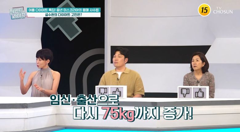 설수현은 다이어트를 하는 이유에 대해 "화면에 티가 안날 뿐"이라며 "19살 때 69.5kg까지 쪘다. 그런데 임신하고 나서 75kg까지 쪘다가 54kg까지 뺐다. 항상 20kg를 넘나드는 생활을 하다보니까 건강하게 다이어트를 해야겠다 싶더라"고 고백했다.