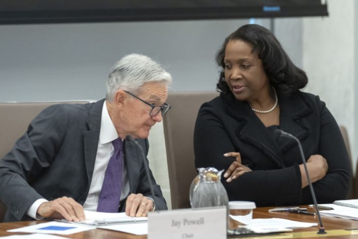 제롬 파월 미 연준 의장(왼쪽)과 리사 쿡 연준 이사. 연합뉴스