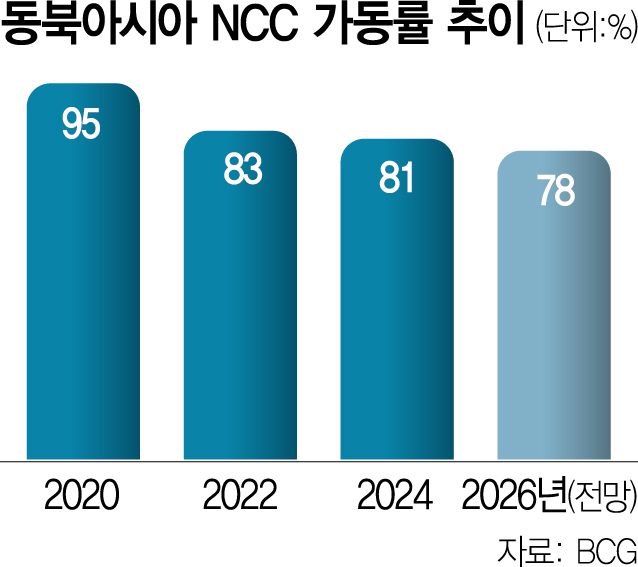 실제 한국의 NCC 설비 규모는 국내 수요의 2배 이상이다. 현재 가동 중인 NCC의 생산 능력은 연간 약 1290만 톤으로 가동률을 고려한 생산량은 1000만 톤가량으로 추정되는데 이 중 내수로 활용하는 비중은 45%에 그치고 있다. 연간 180만 톤 분량의 울산의 샤힌프로젝트가 2026년 상반기 준공되면 생산 과잉은 더욱 가중될 것으로 보인다.