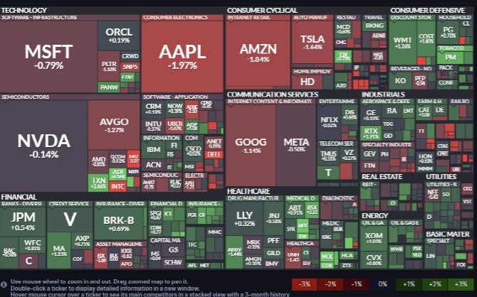 이런 가운데 기술주들이 계속 약세를 보이고 있다. 엔비디아(-0.14%), AMD(-0.81%)와 브로드컴(-1.27%) 등 반도체주에서 차익실현 물량이 나오고 있다. 팔란티어는 1.1% 빠지며 7일 연속 하락세를 이어갔다. 애플(-1.97%), 아마존(-1.84%), 알파벳(-1.14%), 메타(-0.5%) 등 초대형 기술주도 동반 하락했다.